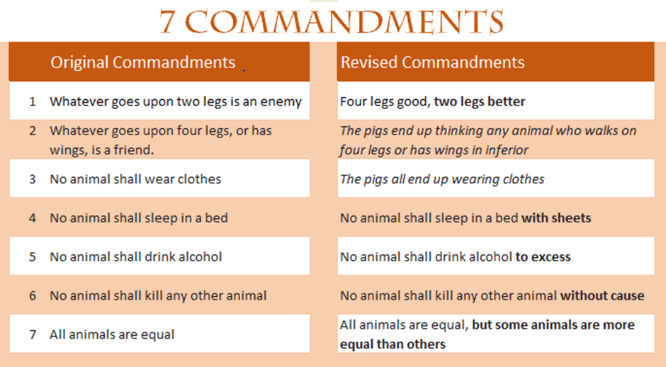 After the rebellion, the animals had adopted Seven Commandments to define the principles on which the farm was to be run. However, after Snowball’s expulsion they realised that the commandments were being changed to their disadvantage, and the benefit of the leaders. Any challenge to the changes in the commandments is ruthlessly dealt with either by propaganda or threat of brute force.